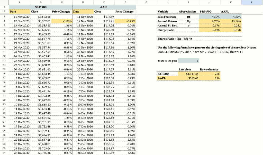 Welcome to the world of Sharpe ratios—a powerful tool in portfolio management that helps investors assess the return of an investment relative to its risk. In this tutorial, we’ll leverage the magic of Google Sheets to calculate Sharpe ratios and compare the performance of Apple stock (AAPL) against the S&P500 over the last three years. We’ve crafted a Google Sheets template to simplify the process, and we’ll guide you through each step.