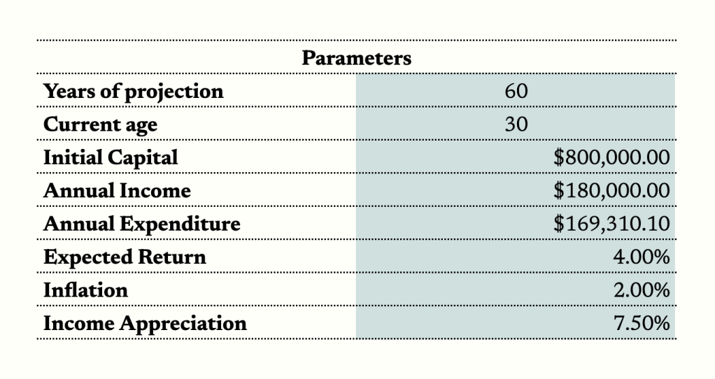 Estimate your current annual expenditure. It’s assumed that this amount will remain relatively constant over the years, adjusted only for inflation.